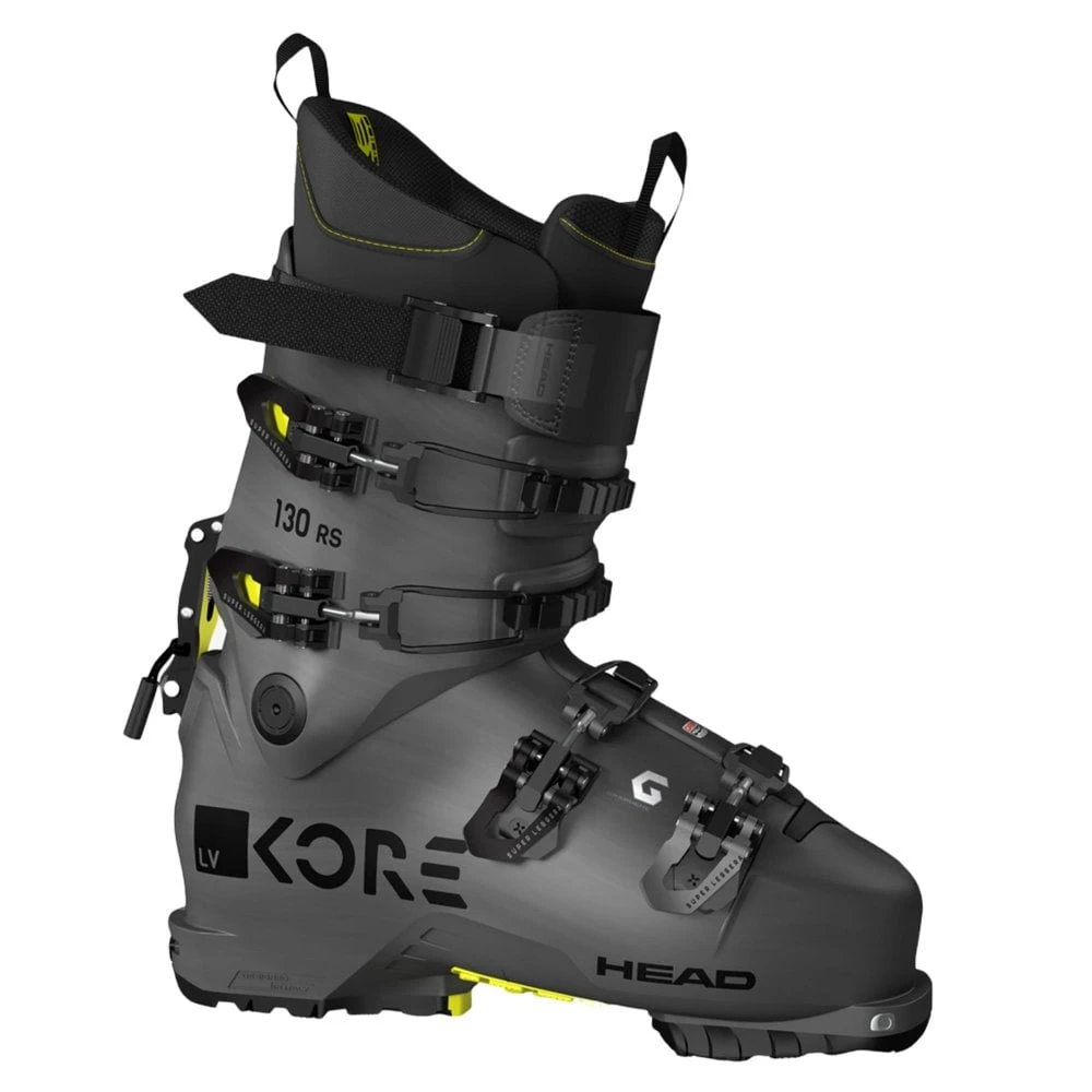 The KORE RS 130 GW features both a new geometry and hike/ski mechanism designed to give expert skiers race-inspired performance for downhill turns as well as comfort while hiking. HEAD’s LYT Tech engineering reduces weight without loosing power transmission. The hike/ski device ensures free movement as well as a strong connection between the cuff and shell, supported by a 53mm Power Strap. The innerboot comes from the Formula series and features the new 98-mm lasted Pro Light liner. Superleggera buckles secure the shell for a precise and comfortable fit. More backcountry-friendly features include GripWalk soles and Dynafit tech inserts.